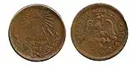 1 ¢3,5517,00CuGorro frigio radiante.Nomograma, guirnalda y año de acuñación.[1]Liso.1915.Aguascalientes.Aguascalientes.