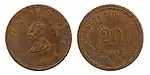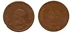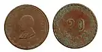 20 ¢?29,00Cu"ESTADO DE AGUASCALIENTES" y escudo nacional.[8][9]"CENTAVOS", numeral, gorro frigio radiante, guirnaldas y año de acuñación.[9]Estriado.1915.Aguascalientes.Aguascalientes.