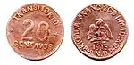 20 ¢Variable.[31]?Ag+Cu"REPÚBLICA MEXICANA", año de acuñación y escudo."20 CENTAVOS" ceca, acuñador y ley.Irregular.Sin fecha.[32]Culiacán.[33]Sinaloa.