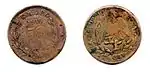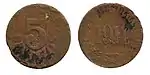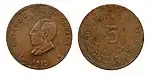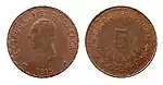5 ¢?25,00Cu"ESTADO DE AGUASCALIENTES" y escudo nacional.Nomograma,[4] guirnalda y año de acuñación.[5]Estriado.1915.Aguascalientes.Aguascalientes.