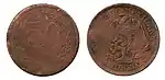5 ¢?25,00Cu"ESTADO DE AGUASCALIENTES" y escudo nacional.Nomograma,[4] guirnalda y año de acuñación.[5]Liso.1915.Aguascalientes.Aguascalientes.