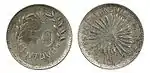 1 ¢3,5517,00AgGorro frigio radiante.Nomograma, guirnalda y año de acuñación.[1]Estriado1915.Aguascalientes.Aguascalientes.