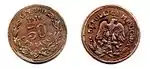 50 ¢Variable.[34]Variable.[35]Ag+CuEscudo de armas mexicano y nombre oficial del país: ESTADOS UNIDOS MEXICANOS. Contramarca: "G.C."Gorro frigio sobre rayos solares.Irregular.Sin fecha.<[36]Culiacán.[21]Sinaloa.