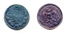 50 ¢Variable.[34]Variable.[35]Ag+CuEscudo de armas mexicano y nombre oficial del país: ESTADOS UNIDOS MEXICANOS.Gorro frigio sobre rayos solares.Irregular.Sin fecha.[36]Culiacán.[21]Sinaloa.