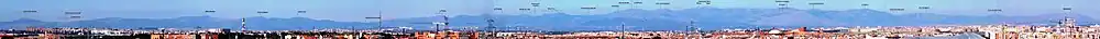 Vista panorámica de la vertiente madrileña de la Sierra de Guadarrama con las principales montañas indicadas. Fotografía tomada desde el cerro Buenavista (sur de la Comunidad de Madrid).