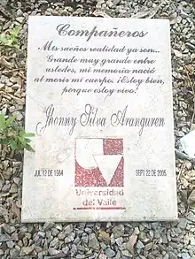 | A Jhonny Silva Araguren | Avenida Jorge Garcés Borrero. Parque Jhonny Silva. Universidad del Valle 3°22′27.77″N 76°32′4.13″O | Placa en granito con pedestal |