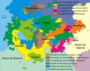 Los 9 (no 8) Estados turingios, hacia 1910 (Thüringische Staaten im Jahr 1910). Hay que tener bien presente, en este sentido, que los Ducados de Coburgo y de Gotha en aquel entonces eran considerados como Estados separados, aunque vinculados por tener un mismo soberano ("unión dinástica"). Cuando abdicó el soberano común, en noviembre de 1918, se deshizo automáticamente cualquier lazo de unión entre ambos territorios.
