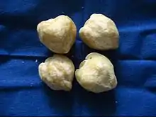 | Nuez de India o Calumbán | Aleurites moluccanus | Semilla de Drupa | El fruto drupáceo es semejante a la nuez común, con piel de color verde, y contiene de 1 a 2 semillas globosas, las nueces, de cáscara dura y un segundo tegumento o piel semejante a las avellanas, con alto contenido en aceite. Las nueces se consumen en platos de cocina suroriental y el aceite es un buen combustible. | ![]() Nueces de India sin cáscara y peladas, listas para comer. |
