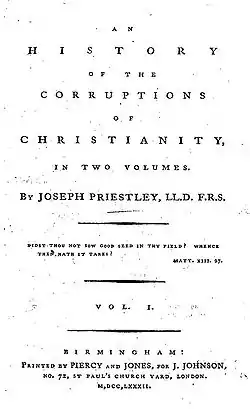 - -. Una Historia de la corrupción del cristianismo. Birmingham: Impreso por Piercy y Jones, por J. Johnson, 1782.
