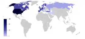 Mapa de países por miembros asistentes a las reuniones del Grupo Bilderberg.