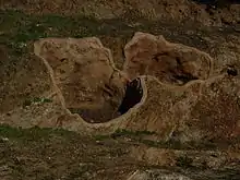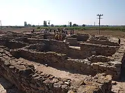 El poblado se construyó en una llanura cerca del río Corb con una superficie habitacble máxima de 2 400 m², se encontraba completamente fortificado por una muralla de cinco metros de anchura. Dentro de la muralla las calles estrechas radiaban a una plaza central y seguían la forma ovalada marcada por el recinto.[41]