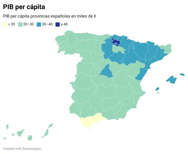 4) La información se ha tomado cogiendo los últimos datos dados por el INE sobre el PIB de cada provincia (2017) y posteriormente se ha dividido ese número entre la cantidad de habitantes de la provincia en el mismo año, dando como resultado el PIB per cápita. (Los datos de los habitantes de 2017 también han sido adquiridos por el INE.)