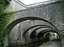 1 arche principale plein cintre, 7 arches secondaires de soutènement en anse de panier