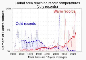 El día más cálido registrado en todo el planeta fue el 6 de julio de 2023, cuando se registró la temperatura media global más alta con 17,08 °C[6] (62,74 °F).[7]