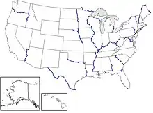 Debido a su singular historia, muchos de los límites de las divisiones políticas de los Estados Unidos fueron establecidos artificialmente (en lugar de evolucionar y ser dibujadas usando accidentes naturales del paisaje). Por ello muchos estados de EE. UU. tienen líneas rectas como fronteras, especialmente en el Oeste. Dicho esto, hay una serie de estados, particularmente en el Medio Oeste, del Noreste y del Sur con fronteras fluviales, al menos parciales.