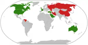 - China: El 29 de agosto de 2013, China manifestó oposición a cualquier intervención militar extranjera en Siria y pidió contención a todas las partes hasta que el equipo de inspectores de la ONU haya investigado el presunto uso de armas químicas en el conflicto.[97]