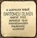 A LLUCHMAYOR VIVIÓ ANTONIO OLIVER NASCUT 1919 DETINGUT 24.1.1943 MARSELLA DEPORTAT 1943 SACHSENHAUSEN ASSASSINAT 7.10.1941 BERGEN-BELSEN |