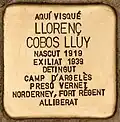 AQUÍ VISQUÉ LLORENÇ COBOS LLUY NASCUT 1919 EXILIAT 1939 DETINGUT CAMP D'ARGELÈS PRESÓ VERNET, NORDERNEY, FORT RÉGENT ALLIBERAT |
