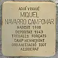 AQUÍ VISQUÉ MIQUEL NAVARRO CAMPOMAR NASCUT 1886 DEPORTAT 1943 TREBALLS FORÇATS CAMP HENNEBONT ORGANITZACIÓ TODT ALLIBERAT |