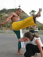 La ginga (pronunciado yinga; literalmente, balanceo) es la técnica fundamental de la capoeira, y su característica más reconocible; sólo algunas artes como el taekkyeon usan un pase similar. Tiene la finalidad mantener al usuario en un movimiento constante rítmico, lo que le prepara para acciones como evadir, fintar o atacar, así como conservar el impulso. Además, debido a que el capoeirista está en constante movimiento, supone un blanco difícil para el oponente.[1] El torso y las piernas se mantienen usualmente bajas para ayudar a esquivar ataques desde arriba y mantener el equilibrio, y la sincronización de los brazos ayuda a esquivar lateralmente. La velocidad de la ginga es normalmente determinada por el ritmo interpretado por la batería.