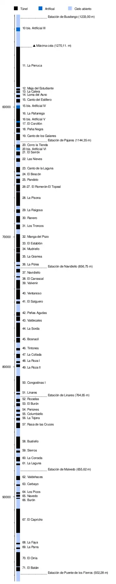 A continuación se enumeran los túneles existentes en la rampa de Pajares, entre la estación de Busdongo y la de Puente los Fierros:[lower-alpha 2]