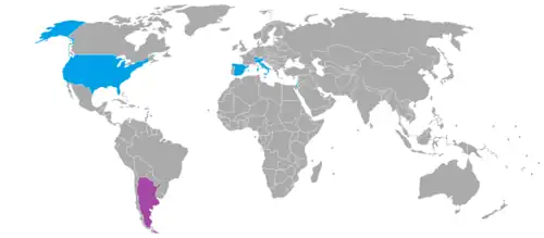 Países visitados por Milei durante su presidencia (en celeste) y Argentina (en purpura).