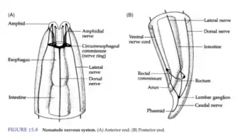 Los anfidios son órganos sensoriales que se encuentran principales en las especies de nemátodos de vida libre como los de la Clase Dorylaimea (antes Adenophorea o Aphasmida). Los anfidios alcanzan su máximo desarrollo en los nemátodos acuáticos, sobre todo en las especies marinas. Son invaginaciones ciegas, tubiformes o saquiformes, de la cutícula. Hay un anfidio a cada lado de la cabeza y usualmente se localizan detrás de las setas cefálicas. Los anfidios contienen quimiorreceptores, aunque es probable que también tengan otras funciones sensoriales, ya que la microscopía electrónica ha revelado que prominencias sensoriales de los anfidios son también cilios modificados.[1] Por otro lado, en la región caudal de ciertos grupos de nemátodos parasitarios, como en los de las clases Chromadorea y Enoplea (antes Secernentea o Phasmida), hay un par de glándulas unicelulares llamadas fasmidios (anfidios de tipo poro) que desembocan por separado a los lados de la cola. Los fasmidos son estructuras glandulosensoriales que intervienen en la quimiorrecepción.[1] Estas últimas estructuras alcanzan su máximo desarrollo en los nematodos parásitos.