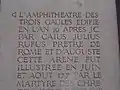 El anfiteatro fue construido al pie de la colina La Croix-Rousse (cruz roja) en lo que fuera entonces la confluencia del Ródano y el Saona. Un inscription en uno de los bloques hallados en 1957 (Inscription latine des Trois Gaules, n°217 (AE 1959, n°61)) conecta el anfiteatro con el santuario de Roma y Augusto y permite identificar su origen: