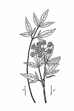 Es una hierba perenne que crece con un tallo erecto, hueco y alcanza un tamaño de entre uno y dos metros de altura. Produce hojas grandes algo triangulares formadas por muchas hojas dentadas y puntiagudas cada una de hasta 9 centímetros de largo. La parte superior del vástago está ocupado por una inflorescencia en forma de umbela, con rayos palmeados de la umbela de hasta 10 centímetros de largo cada uno. Las flores son generalmente de color amarillento.