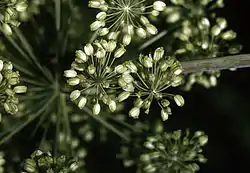 La planta crece hasta los 180 cm de altura con una ramificación erecta con el tallo de color púrpura. El tallo es liso, hueco y robusto. Las hojas se dividen en tres partes, cada una con su propio pecíolo. Cada parte de la hoja se subdivide en tres a cinco segmentos. El total de la anchura de una hoja inferior puede ser de hasta 60 cm. La planta tiene flores de color blanco a verdoso formando como cabezas en forma de paraguas. Una cabeza puede tener hasta 40 rayos y 20 cm de ancho.