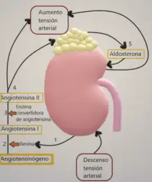 Las células yuxtaglomerulares secretan renina en el túbulo contorneado distal de las nefronas del riñón. Esta enzima cataliza la conversión del angiotensinógeno (proteína secretada en el hígado) en angiotensina I, mediante la rotura del enlace entre Leu-10 y Val-11 del angiotensinógeno; más tarde es convertida en angiotensina II por acción de la enzima convertidora de angiotensina (ECA), secretada por las células endoteliales de los pulmones y los riñones. Esta última es el vasoconstrictor más intenso o eficaz del organismo. Por demás, estimula la secreción de vasopresina (hormona antidiurética ADH) por la neurohipófisis, que estimula la reabsorción a nivel renal de agua y produce la sensación de sed; y de la hormona aldosterona (en las glándulas suprarrenales) produciendo la reabsorción de sodio, también a nivel renal.[6][7]