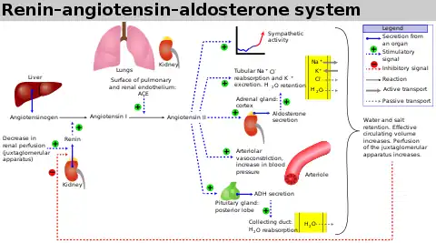 La angiotensina II actúa sobre la corteza suprarrenal, causando la liberación de aldosterona, una hormona que hace que los riñones retengan sodio y pierdan potasio. Los altos niveles plasmáticos de angiotensina II son responsables de los elevados niveles de aldosterona presentes durante la fase lútea del ciclo menstrual.