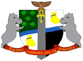 ![]() Escudo: Un Escudo, dividido en cuatro por un río (el Ankh) y una torre (la torre del Arte). Dos cuartos tienen una bolsa de dinero, otro un campo de coles y el último un cuadro negro de los Vetinari. El escudo está escoltado por dos hipopótamos y un morpork sosteniendo un ankh entre sus patas. Himno Nacional: We Can Rule You Wholesale | ||