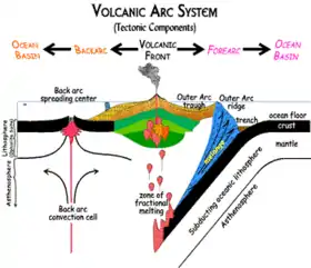Durante un proceso de subducción, una placa oceánica se empuja debajo de otra placa tectónica, que puede ser oceánica o continental. El agua y otros fluidos en la placa descendente causan un flujo que se derrite en el manto superior, creando un magma que se eleva y penetra en la placa superior, formando un arco volcánico. El peso de la losa descendente flexiona la placa adyacente creando una fosa oceánica. El área entre la fosa y el arco es la región del antearco, y el área detrás del arco (es decir, en el lado más alejado de la fosa) es la región del arco posterior o retroarco.
