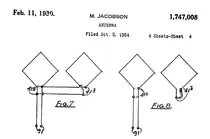 1924, Moses Jacobson, inventa y patenta una serie de antenas de bucle en forma de rombo, tal como puede apreciarse en la patente original; US1747008