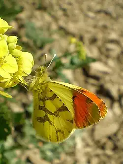 El imago presenta variación de coloración entre ambos sexos. El macho es amarillo limón con una prominente mancha naranja al ápice alar culminada por una zona marrón. La hembra, en cambio, es blanca con una mancha en el ápice naranja y marrón y una mancha negra en las alas anteriores. Reverso de las alas posteriores amarillo con manchas verdes oliva en los dos sexos.