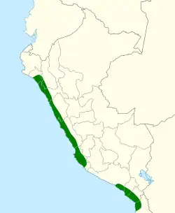 Anthus peruvianus está geográficamente aislada de A. lutescens, ya que esta última habita en pastizales y explotaciones agropecuarias de tierras bajas al este de los Andes mientras que A. peruvianus vive también a baja altitud, pero en una franja bastante estrecha junto al océano Pacífico (al poniente de los Andes) en ambientes de vegetación desértica inducida por la niebla. Se distribuye por el norte desde Lambayeque (en la provincia homónima del departamento homónimo) en el litoral noroeste del Perú hacia el sur hasta alcanzar la ciudad de Arica en el extremo norte de Chile.[6]
