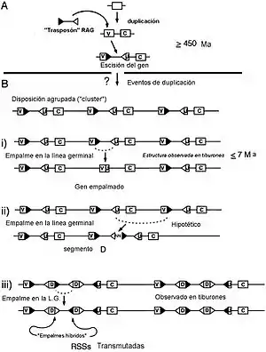 La recombinación somática de las inmunoglobulinas, conocida también como Recombinación V (D) J, consiste en la generación de una región variable de inmunoglobulina exclusiva. La región variable de cada inmunoglobulina pesada está codificada por varias partes, que se conocen como segmentos. Estos son conocidos como segmento variable (V), diversidad (D) y de acoplamiento —joining, en inglés— (J).[44] Los segmentos V, D y J se encuentran en las cadenas pesadas. En las ligeras solo encontramos los segmentos V y J. Hay múltiples copias de todos estos segmentos organizadas en tándem en el genoma de los mamíferos. En la médula ósea cada linfocito B en desarrollo ensambla la región variable de su inmunoglobulina seleccionando y combinando al azar un segmento V con uno D y otro J (o bien uno V y otro J en la cadena ligera). Puesto que existen múltiples copias ligeramente distintas para cada secuencia genética de los segmentos, se darían diferentes combinaciones que mediante este proceso generan un elevado número de paratopos y también diferentes especificidades de antígeno.[2]