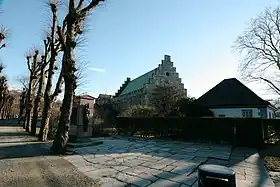 Cimientos de la Catedral de Bergen. Se aprecia un monumento a Santa Sunniva, y al fondo, el Håkonshallen.