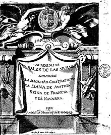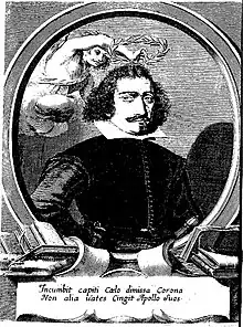 ![]() Retrato de Antonio Enríquez Gómez, grabado de Michel Lasne. Ilustración de Academias morales de las musas, estampada en Burdeos por Pedro de la Court en 1642. Firma en la repisa, a la izquierda, "ML [enlazadas] fe." | ||