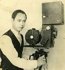 ![]() Wong Rengifo usando una cámara cinematográfica. | ||