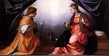 Según afirma Giorgio Vasari en Las vidas de los más excelentes arquitectos, pintores y escultores italianos, esta Anunciación fue concebida como coronamiento de un altar de la iglesia dei Servi de Florencia[1] (según otras fuentes,[2] estaba destinada a un retablo dedicado a santo Domingo en la ciudad ligur de Sarzana). Nunca llegó a instalarse en ningún retablo y la Anunciación permaneció en poder, durante un periodo de tiempo impreciso, de Giuliano Della Scala. La forma original de la pintura era de luneto, pero fue modificada a rectangular, bien por el propio artista o bien (según Alessandro Cecchi) por Jacopo Zucchi en Roma en 1584. Para ello, se añadieron en la pintura los cortinajes azules que se aprecian actualmente.