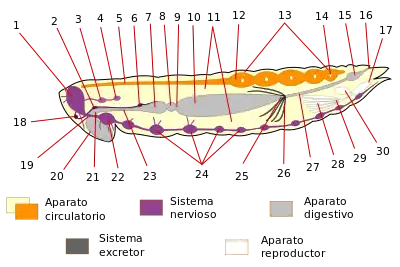El aparato reproductivo del macho es similar al de la hembra. Consiste de dos testículos, ductos que desembocan al exterior y glándulas accesorias. Cada testículo consiste de un grupo de tubos espermáticos o folículos en los que se desarrollan los espermatozoides.