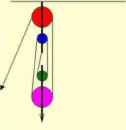 La resistencia Q está formada por dicha carga y el peso de la parte móvil del aparejo. La figura muestra un aparejo con dos poleas fijas y dos móviles. La fuerza P que se debe realizar es, en este caso, la cuarta parte de la fuerza Q, está sostenida por cuatro cuerdas cuyas tensiones son iguales. En general, si el número de poleas móviles que se encuentran fijas entre sí es N (coplanares o en paralelo), la fuerza P será: