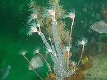 Ectopleura crocea recubierta parcialmente por esponja incrustante