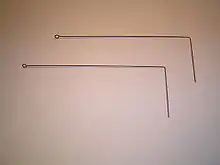 Hoy en día, muchos radiestesistas utilizan un par de varillas metálicas en forma de L. Se sujeta una varilla en cada mano, con el brazo corto de la L en posición vertical y el brazo largo apuntando hacia delante. El brazo vertical suele girar libremente dentro de un tubo. Cuando se "encuentra" algo, las varillas se mueven en sincronía. Dependiendo del radiestesista, pueden cruzarse o separarse.[3] Si el objeto es largo y recto, como una tubería de agua, las varillas pueden apuntar en direcciones opuestas para mostrar su orientación. Las varillas pueden estar hechas de perchas de alambre o banderas de alambre utilizadas para localizar servicios públicos. También se han aceptado varillas de cristal o plástico. Las varillas rectas también se utilizan a veces con los mismos fines y no eran infrecuentes en la Nueva Inglaterra de principios del siglo XIX.