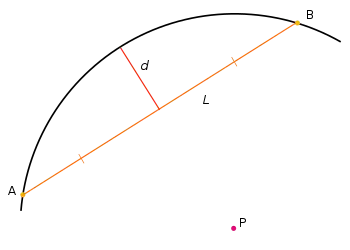 Es posible determinar el radio de un arco de circunferencia si se conoce la longitud de una cuerda y, a la vez, la distancia entre el punto medio de la cuerda y el punto medio del arco determinado por la cuerda. Con la fórmula
