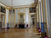 - una salle des gardes (al principio del appartement, solo si es un palacio real): es la estancia más abierta del appartement, aquella donde permanece la guardia real día y noche. Es heredera de la salle de los castillo medievales, inmenso espacio completamente abierto al público y con un función polivalente: grandes banquetes, audiencias solemnes o mercadillos de los proveedores de la Corte.