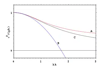 El error relativo en la velocidad de fase para la ecuación B es menor del 4% para kh < 2π/7, equivalente a las longitudes de onda λ más largas que 7 veces la profundidad del agua h, llamadas ondas relativamente largas.[5] El conjunto original de dos ecuaciones diferenciales parciales (Boussinesq, 1872, ecuación 25, véase el conjunto A anterior) no tiene este defecto.