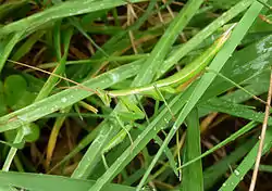 Suele presentar coloración verde, aunque también hay miembros grisáceos y marrones. Es de tamaño pequeño, siendo la longitud de las hembras mayor que la de los machos, llegando a máximos de 36mm y 28mm respectivamente.[3] El pronoto también es mayor en hembras, hasta 8.5mm, y en machos hasta 6mm. Su cabeza, con forma triangular, acumula la mayor diferenciación frente a otros taxones. Sus dos ojos compuestos se ubican en el extremo superior, adquiriendo forma cónica (alargándose hacia arriba).[3] Las antenas son más largas en machos que en hembras. Como su nombre indica, es áptero, es decir, hay ausencia de alas en ambos sexos y durante todos los estadios de su vida. Tampoco presenta élitros. La falta de estas estructuras se considera un limitante de la capacidad dispersiva de la especie.[4]